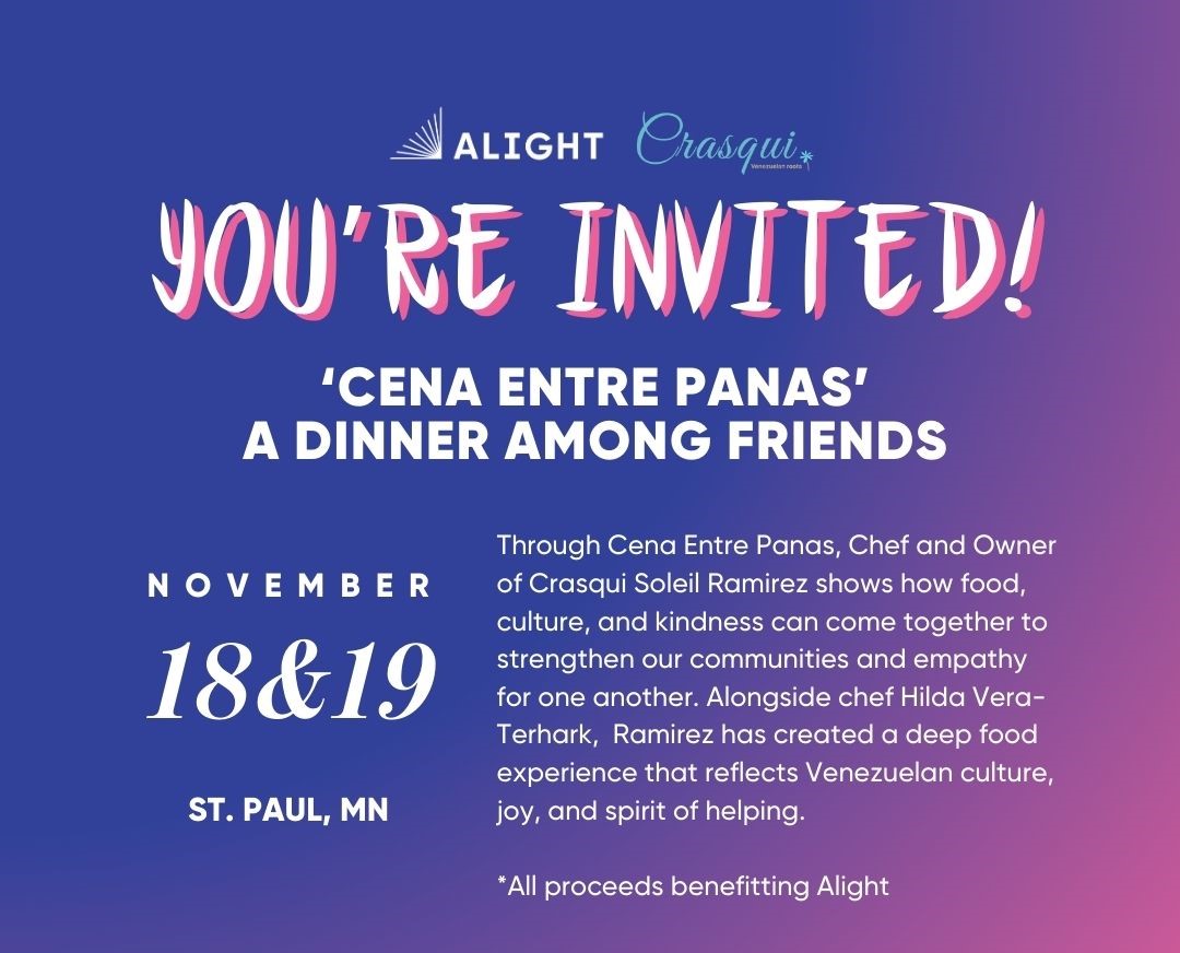 Join us on Tuesday & Wednesday, November 18th & 19th at Crasqui restaurant, for the final two dinners in Chef Soleil Ramirez' Cena Entre Panas dinner series. She’ll close the series with two - 6-course dinners at her St. Paul restaurant Crasqui, alongside Chef Hilda Vera-Terhark. All proceeds from the evenings will benefit Alight’s work with displaced families. More details below.